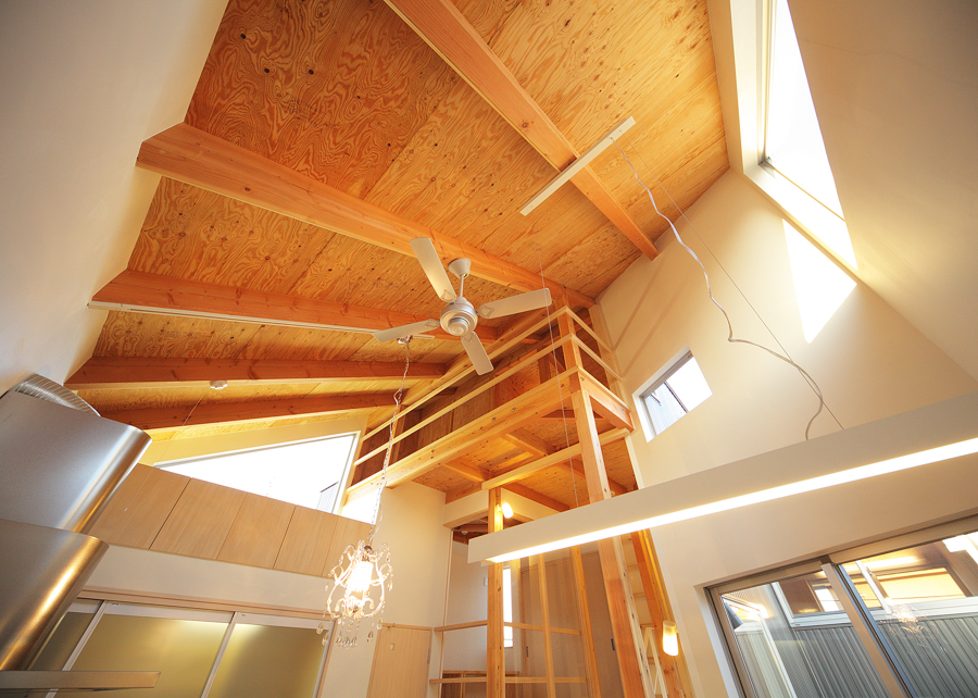 | 以前から親しんだ約28坪の土地に、2世帯住宅として再びみんな集まって住みながら、 子供達を見守り育ててゆきたいという想いから家づくりがスタートしました。 明るく、開放感がありながらもそれぞれの居場所がある、父・夫婦・そして子供へと思い出の詰まっ た家にしてほしいとのニーズを受けての設計となりました。 敷地28坪、北・東・西3方向道路の住宅地の中に家族5人が集まって住むという延べ面積26坪 あまりの狭小住宅で、開放感やそれぞれが落ち着いて生活出来る空間を実現するためにスキップフ ロア形式としています。 3方向道路しかも全て幅員4mと斜線制限が厳しく建物をあまり高くすることが出来ない中で、 階段を建物の中心に据え長方形の平面を4つのブロックに分け、立体的に配置する事でそれぞれの プライバシーに配慮しながら室を多く確保出来、拡がりのある快適な居住空間を実現しています。 また、階高を抑えながらも天井の形状・工法を工夫することで、各室とも縦方向に伸びやかで豊か な内部空間を造ることが出来ました。 特に最上階となるダイニング・キッチンは、屋根形状をそのまま生かした斜めの高天井とし、ロフト・ ハイサイドライトを設けることでダイナミックで開放的な明るい空間となっています。 |